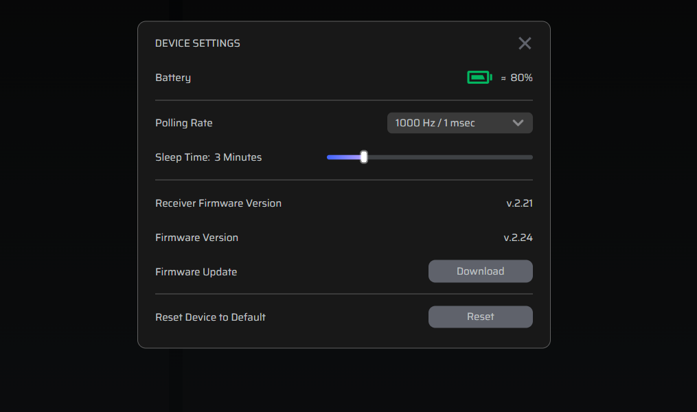 Sabre v2 Pro sử dụng thiết kế không dây với thời lượng pin lên tới 70 giờ ở chế độ 2.4GHz và Polling Rate tiêu chuẩn 1.000Hz. Nếu kích hoạt chế độ Hyper-Polling 8.000Hz, pin giảm xuống khoảng 16 giờ, nhưng đổi lại là độ phản hồi gần như tức thì. Với những ai chơi game FPS, tốc độ lấy mẫu 8.000Hz giúp chuột gửi tín hiệu đến PC nhanh gấp 8 lần so với chuột thông thường, cho cảm giác chuyển động liền mạch và chính xác.